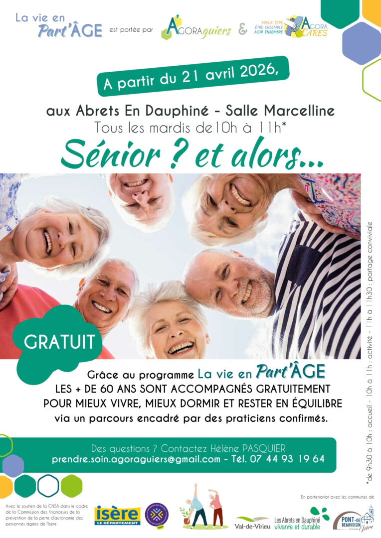 L’association AGORA Cares, née au sein du tiers-lieu AGORA Guiers, annonce le lancement officiel de son programme innovant « La vie en Part’ÂGE ». À partir du lundi 20 avril 2026, ce dispositif soutenu par le Département de l’Isère et la CNSA propose un accompagnement hebdomadaire aux seniors de plus de 60 ans et à leurs aidants sur les communes de Pont-de-Beauvoisin, Val de Virieu et Les Abrets en Dauphiné.